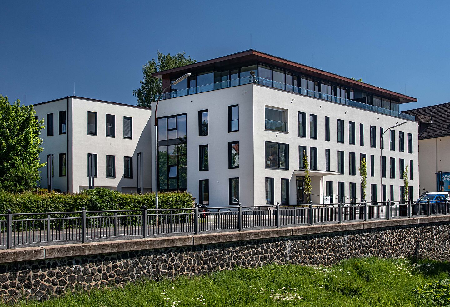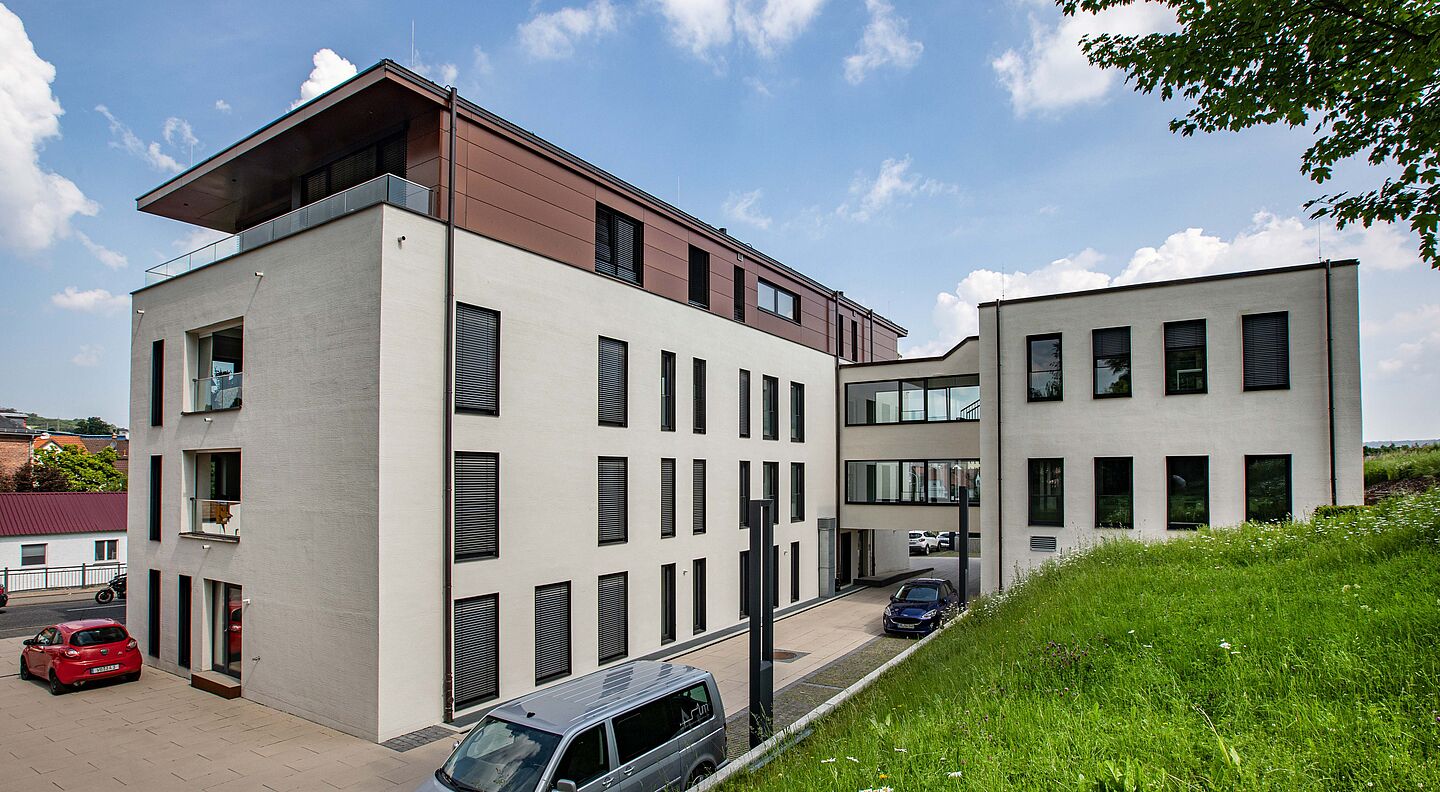 Im Zuge der Sanierung wurde das Gebäude um eine Etage aufgestockt. Die Holzbauweise mit dem geringen Gewicht ist dafür geradezu prädestiniert. Im neu gewonnenen Platz sind zwei 100 qm große Penthouse-Wohnungen mit einem besonders schönen Ausblick untergekommen. Mit dieser Maßnahme wurde die bestehende Verbindungsbrücke zwischen Hauptgebäude und altem Sitzungssaal ebenso aufgestockt. Zu den großen Sanierungsaufgaben gehörte die Erneuerung der Treppenanlage. Durch zwei baulich voneinander getrennte Treppen sind Mieter vom Hochschul- und Bürobetrieb getrennt. Für die barrierefreie Erschließung aller Etagen sorgt ein neuer Aufzug.