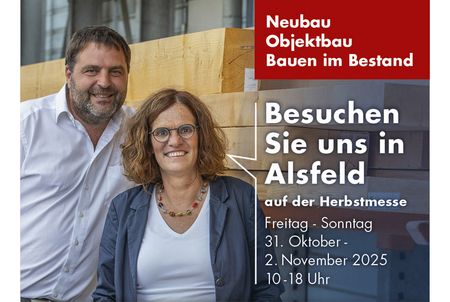 Die Herbstmesse Alsfeld bietet viele Informationen, Neuheiten, Dienstleistungen, Sonderschauen und Unterhaltung durch ein attraktives Rahmenprogramm für Besucher jeden Alters, insbesondere die ganze Familie. Wir würden uns freuen, Sie auf eine Tasse Kaffee bei uns am Stand zu begrüßen. Viele Informationen rund um den Holzhausbau liegen für Sie bereit.